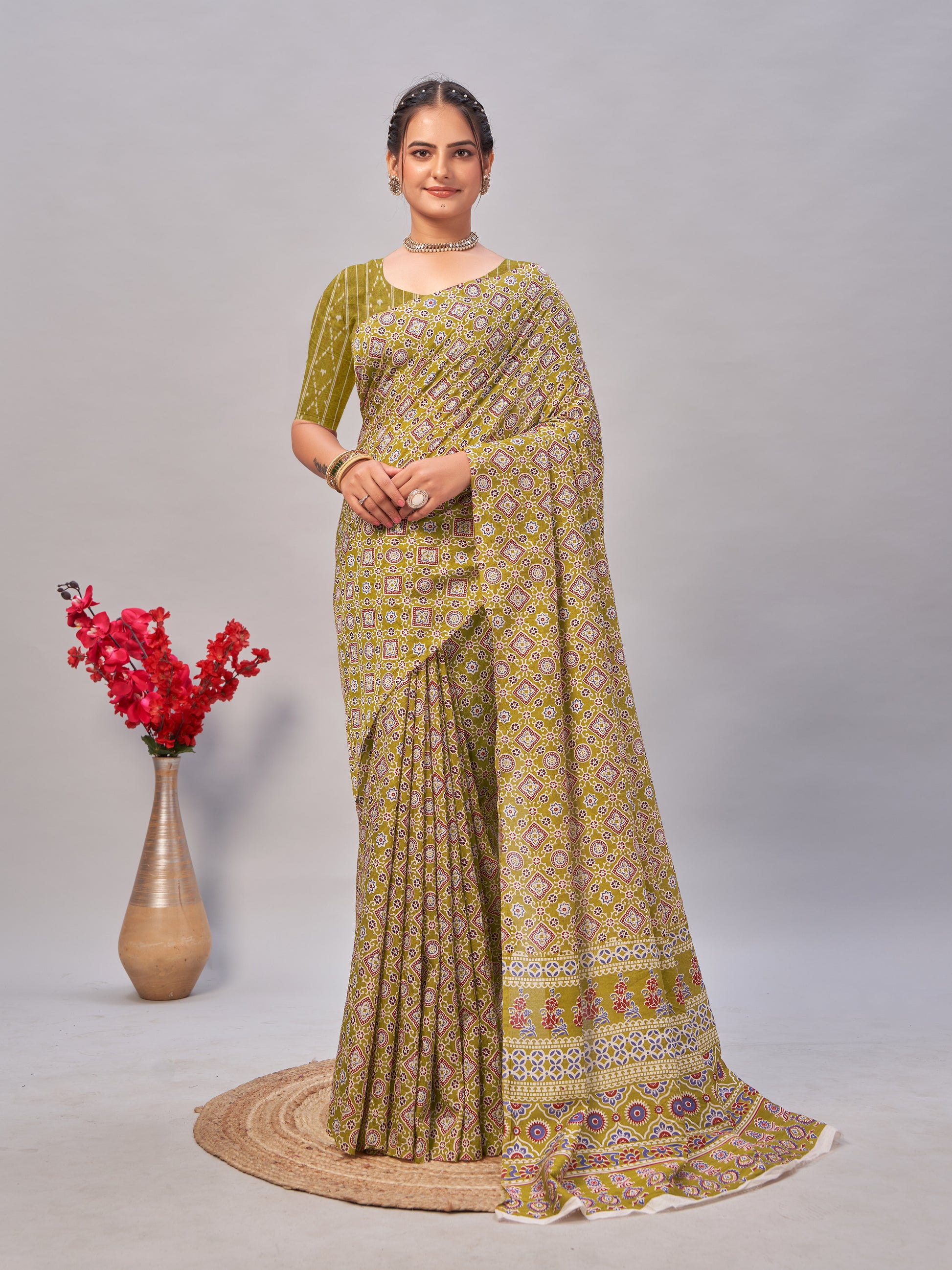 Add sunshine to your wardrobe with our Soft Cotton Ajrakh Print Saree in vibrant Poster Yellow. Made from ultra-soft pure cotton, this saree features traditional Ajrakh block printing with natural dyes – a perfect blend of heritage and comfort.