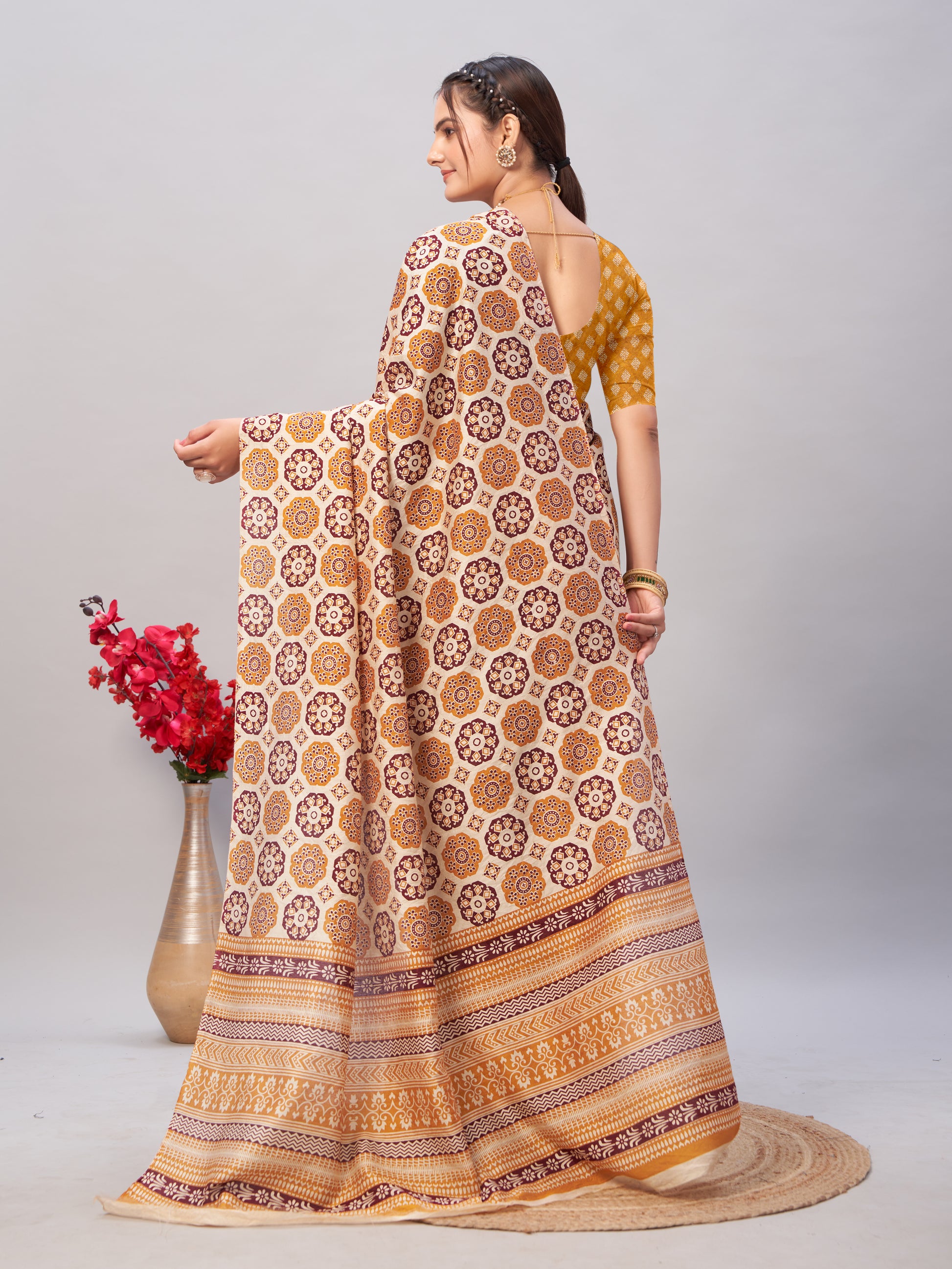 Add a burst of warmth and tradition to your wardrobe with this Soft Cotton Yellow Saree, featuring a distinctive Ajrakh print pattern. The cheerful yellow hue paired with detailed block printing makes this piece stand out with subtle sophistication.