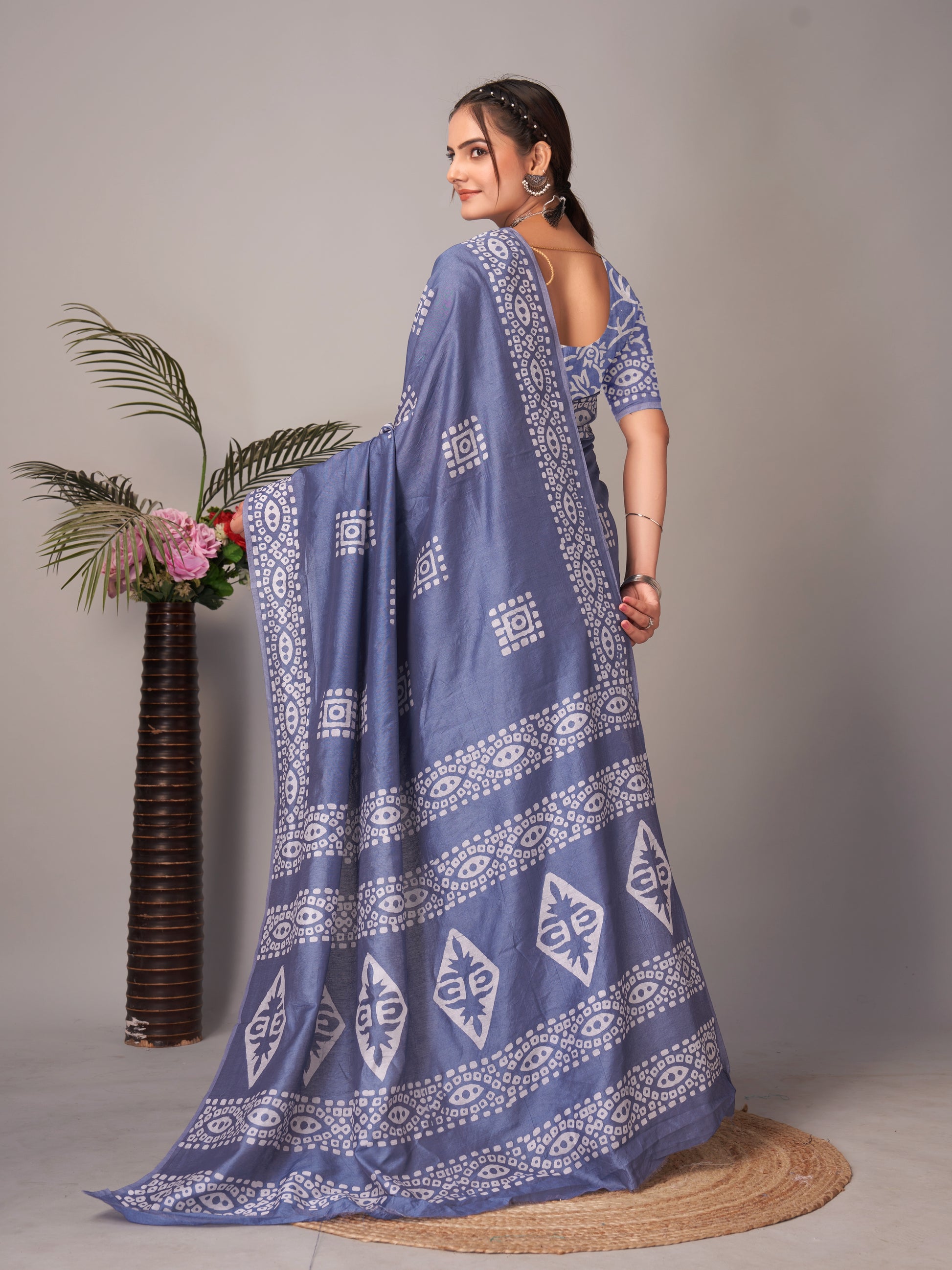 Elevate your everyday ethnic look with this sophisticated Box Grey Batik Print Saree, made from soft pure cotton and adorned with delicate handcrafted Batik patterns. The muted grey tone paired with traditional white motifs brings a calming and graceful presence to your wardrobe.